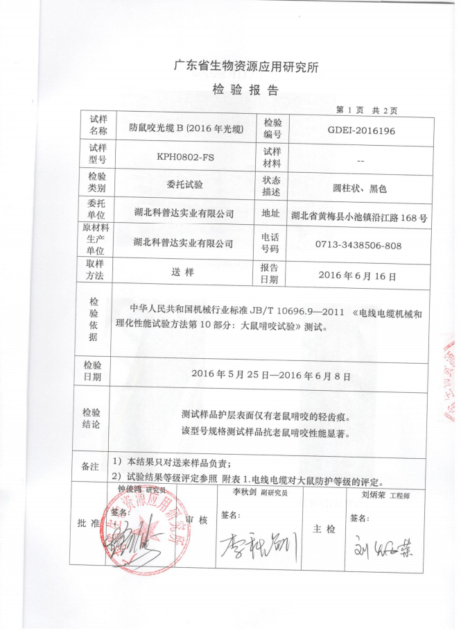 科普達(dá)防鼠咬光纜檢測(cè)報(bào)告KPH0802-FS(B樣)