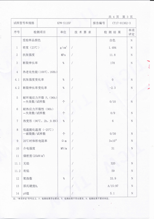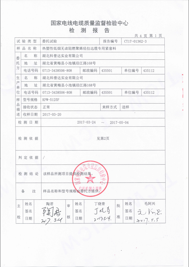 KPW-5125F熱塑性低煙無鹵阻燃聚烯烴拉遠(yuǎn)纜專用緊套料檢測(cè)報(bào)告
