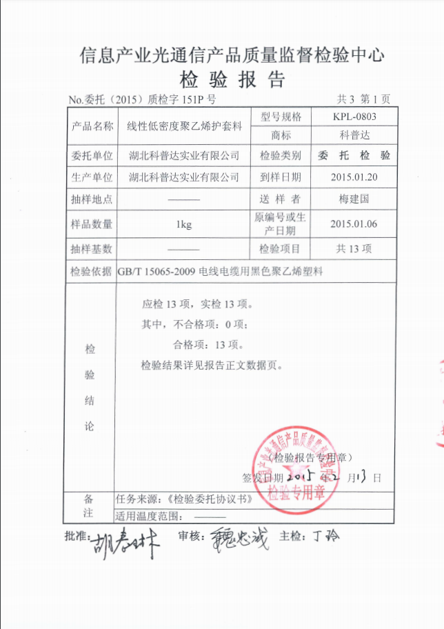 科普達產品主要有各種光纜護套料,榮獲湖北省名牌產品,守合同重信用企業。 榮獲多種國家資質認證包括:ISO9001質量管理體系認證、ISO14001環境管理體系及OHSAS18001職業健康安全管理體系認證。...